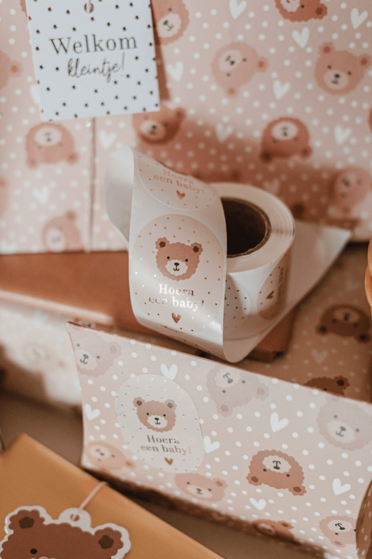 Voeg wat liefde toe aan je inpakmoment met deze schattige beertjes stickers. De stickers hebben een mooie opdruk en een luxe goudfolie afwerking. Leuk voor (kraam) cadeautjes, bestellingen of voor een babyshower.