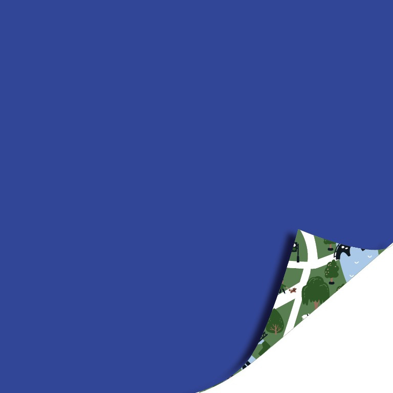 - Design: little village aan de ene kant, effen blauw aan de andere kant