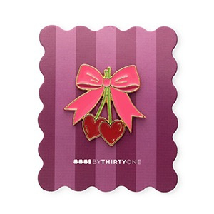 🍒🎀 Voeg een speels detail toe aan je outfit met deze losse pin met kers en strikje. De charmante pin is bevestigd op een stijlvol gestreept kaartje in de kleur burgundy en is perfect om te dragen op een jas, tas of etui.