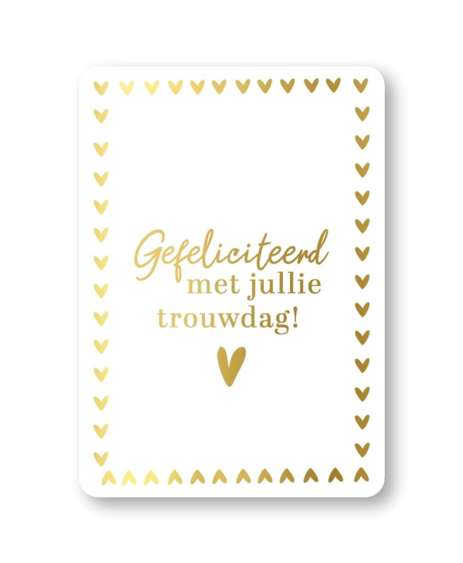 Wenskaart met de tekst “Gefeliciteerd met jullie trouwdag!”. Een mooie en persoonlijke kaart om jouw boodschap op te schrijven. Specificaties: ∙ Formaat: A6 ∙ Luxe afwerking met goudfolie ∙ Mooi stevig papier ∙…