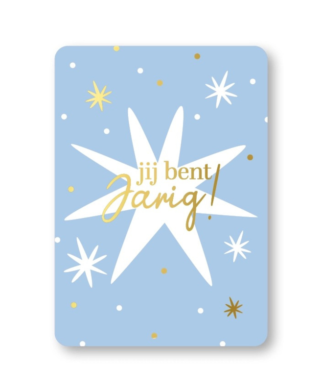 Wenskaart met de tekst “Jij bent jarig!”. Een stoere en persoonlijke kaart om jouw felicitatie op te schrijven. Specificaties: ∙ Formaat: A6 ∙ Luxe afwerking met goudfolie ∙ Mooi stevig papier ∙ Geschikt om zelf…