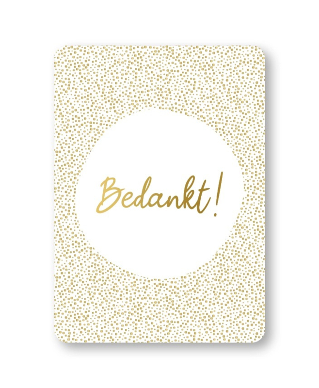 Wenskaart met de tekst “Bedankt!”. Een mooie en persoonlijke kaart om jouw boodschap op te schrijven om iemand te bedanken. Specificaties: ∙ Formaat: A6 ∙ Luxe afwerking met goudfolie ∙ Mooi stevig papier ∙…