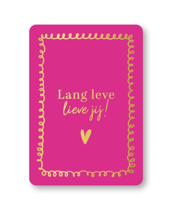 Wenskaart met de tekst “Lang leve lieve jij!”. Een vrolijke en persoonlijke kaart om jouw boodschap op te schrijven. Specificaties: ∙ Formaat: A6 ∙ Luxe afwerking met goudfolie ∙ Mooi stevig papier ∙ Geschikt om…