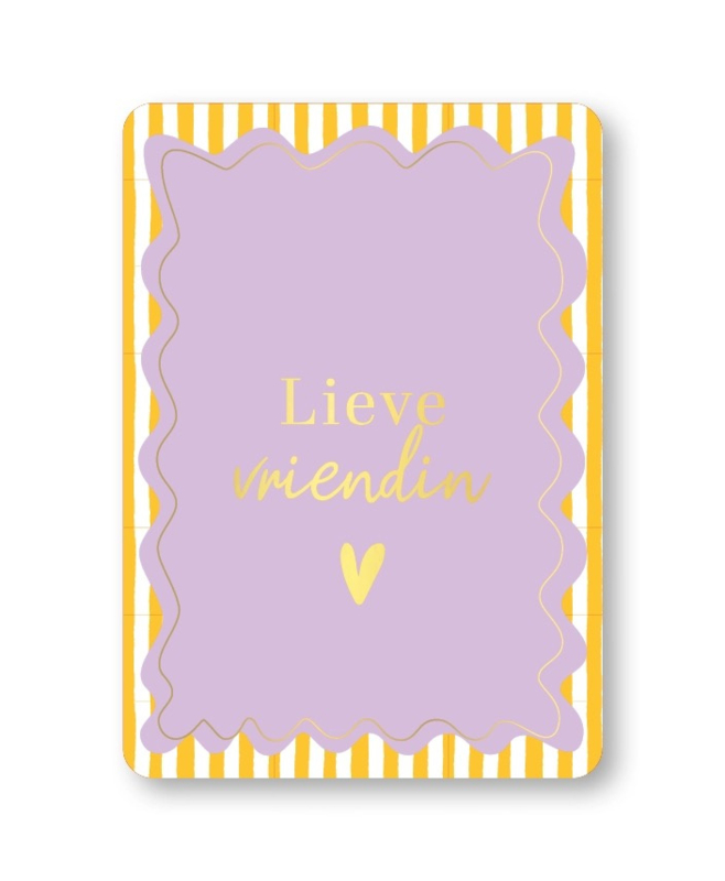 Wenskaart met de tekst “Lieve vriendin! ”. Een vrolijke en persoonlijke kaart om jouw boodschap op te schrijven. Specificaties: ∙ Formaat: A6 ∙ Luxe afwerking met goudfolie ∙ Mooi stevig papier ∙ Geschikt om zelf…
