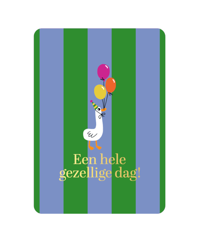 Wenskaart met de tekst “een gezellige dag”. Een mooie kaart die geschikt is om iemand een fijne dag te wensen of als extraatje bij een cadeautje. Extra leuk met de gans als detail.
