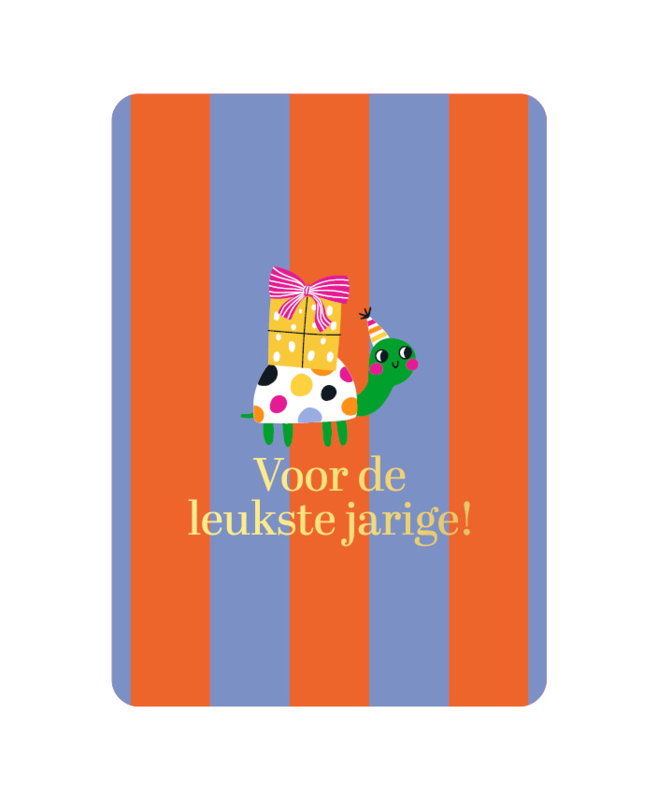 Wenskaart met gestreepte achtergrond, goudfolie accenten en de tekst “Voor de leukste jarige”. Op de kaart staat een schildpad met cadeautjes op zijn rug. Geschikt voor verjaardagen en om iemand op een leuke manier te…