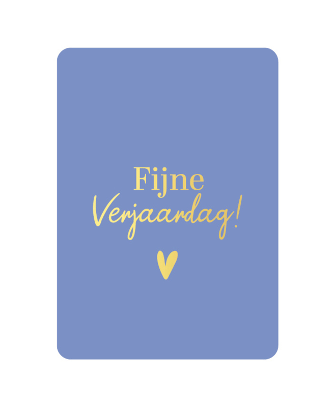 Wenskaart met de tekst “Fijne verjaardag”, afgewerkt met goudfolie en vrolijke details. Geschikt voor verjaardagen en om iemand op een leuke manier te feliciteren.